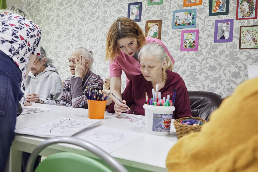 - Разнообразный досуг. Педагог-аниматор пансионата для престарелых организует интересные развлекательные мероприятия, проводит индивидуальные занятия по развитию мелкой моторики.